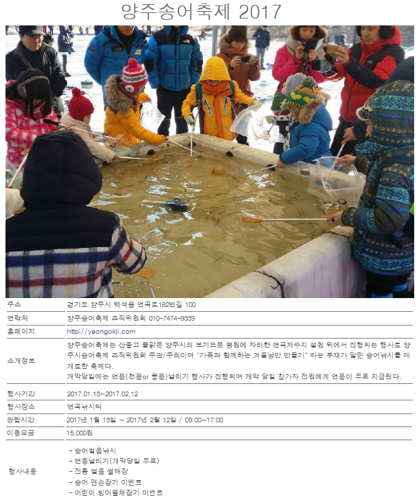 2017년 1월 경기도축제 - 양주 송어축제 페이지 정보 작성자 관리자 댓글 0건 조회 1,194회 작성일 17-01-12 11:36 목록 본문 이전글[레시피] 쑥호두달걀말이 17.01.12 다음글 [레시피]곶감시금치무침 16.12.06 댓글 0 댓글목록 등록된 댓글이 없습니다.