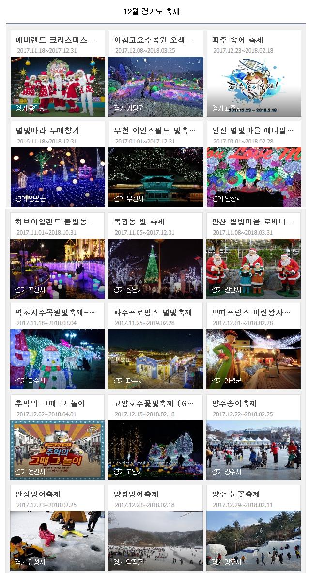 12월 경기도축제 페이지 정보 작성자 관리자 댓글 0건 조회 1,191회 작성일 17-12-05 15:33 목록 본문 이전글[설연휴 N 여행] 수도권: 51도 미네랄 온천서 피로 풀고 빙어낚시…강화 석모도 18.02.14 다음글11월 경기도축제2 17.11.14 댓글 0 댓글목록 등록된 댓글이 없습니다.