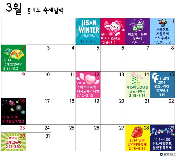 2014년 3월 경기도축제달력 페이지 정보 작성자 관리자 댓글 0건 조회 1,364회 작성일 14-03-06 12:09 목록 본문 이전글2014년 4월 나들이 정보 14.03.25 다음글2014년 3월 나들이 정보 14.02.21 댓글 0 댓글목록 등록된 댓글이 없습니다.