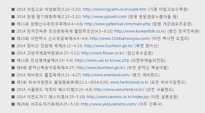 2014년 경기도 축제달력 홈페이지 페이지 정보 작성자 관리자 댓글 0건 조회 1,386회 작성일 14-04-01 17:43 목록 본문 이전글2014년 5월 경기도축제달력 14.04.23 다음글2014년 4월 경기도축제달력 14.04.01 댓글 0 댓글목록 등록된 댓글이 없습니다.