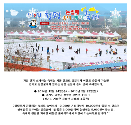 청평송어빙어축제 페이지 정보 작성자 관리자 댓글 0건 조회 1,439회 작성일 15-01-07 16:28 목록 본문 이전글자라섬씽씽겨울축제 15.01.07 다음글초코렛 공연 14.12.04 댓글 0 댓글목록 등록된 댓글이 없습니다.
