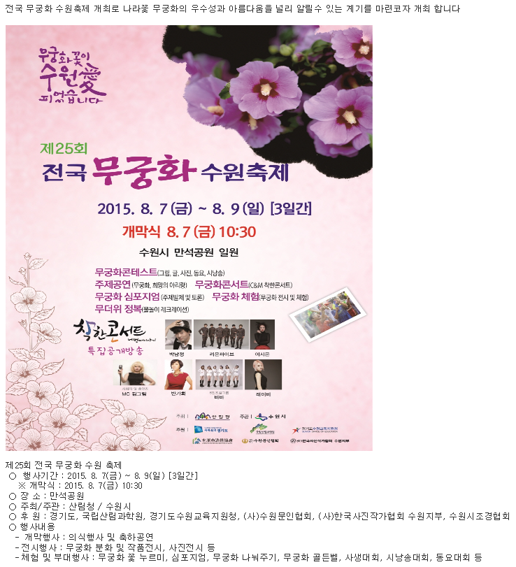 8월 수원축제 페이지 정보 작성자 관리자 댓글 0건 조회 1,311회 작성일 15-08-03 16:23 목록 본문 이전글9월 경기도 축제 15.09.04 다음글8월 양평축제 15.08.03 댓글 0 댓글목록 등록된 댓글이 없습니다.