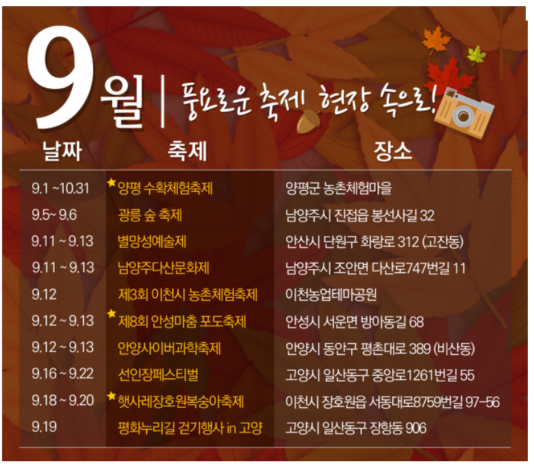 9월 경기도 축제 페이지 정보 작성자 관리자 댓글 0건 조회 1,393회 작성일 15-09-04 10:48 목록 본문 다가온 가을을 물씬 느끼고 싶다면, 경기도 9월 축제 일정을 참고하세요. 이전글10월1주 경기도 축제 15.10.05 다음글8월 수원축제 15.08.03 댓글 0 댓글목록 등록된 댓글이 없습니다.
