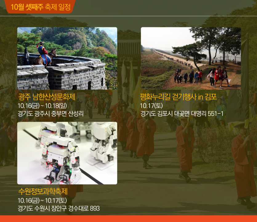 10월3주 경기도 축제 페이지 정보 작성자 관리자 댓글 0건 조회 1,244회 작성일 15-10-05 09:50 목록 본문 이전글10월4주 경기도 축제 15.10.05 다음글10월2주 경기도 축제 15.10.05 댓글 0 댓글목록 등록된 댓글이 없습니다.