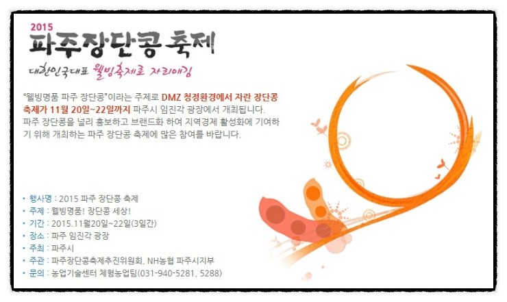 11월 경기도 장단콩 축제 페이지 정보 작성자 관리자 댓글 0건 조회 1,214회 작성일 15-11-02 16:15 목록 본문 이전글11월 경기도 아침고요수목원 축제 15.11.02 다음글11월 경기도 축제 15.11.02 댓글 0 댓글목록 등록된 댓글이 없습니다.