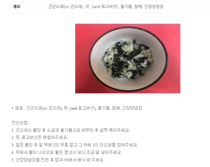 [레시피]곤드레무밥 페이지 정보 작성자 관리자 댓글 0건 조회 1,069회 작성일 16-12-06 10:40 목록 본문 출처-서울시육아종합지원센터 이전글 [레시피]곶감시금치무침 16.12.06 다음글[레시피]무말랭이쇠고기밥 16.11.01 댓글 0 댓글목록 등록된 댓글이 없습니다.