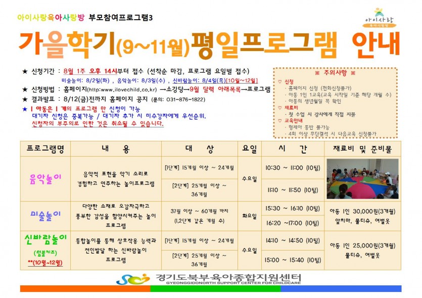 [부모자녀참여프로그램] 가을학기 평일프로그램 안내(9~11월) 페이지 정보 작성자 관리자 댓글 0건 조회 5,751회 작성일 16-07-15 17:58 목록 본문 이전글[감성어린이극] 구공탄눈사람 8월31일(수) 14시 ~15시 16.07.20 다음글8월 [재능기부] 곰인형 만들기 16.07.14 댓글 0 댓글목록 등록된 댓글이 없습니다.