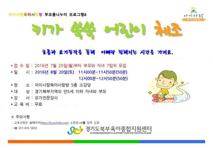 8월 [주말프로그램] 키가 쑥쑥 어린이 체조 페이지 정보 작성자 관리자 댓글 0건 조회 5,449회 작성일 16-07-20 16:11 목록 본문 이전글[가을학기 신바람놀이] 텀블키즈 일정 변경안내 16.07.20 다음글[감성어린이극] 구공탄눈사람 8월31일(수) 14시 ~15시 16.07.20 댓글 0 댓글목록 등록된 댓글이 없습니다.