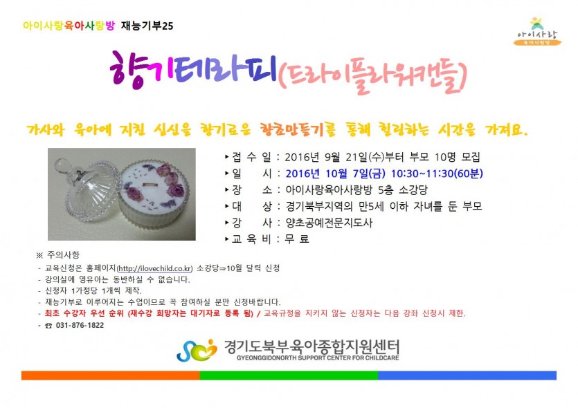 가사와 육아에 지친 심신을 향기로운 향초만들기를 통해 힐링하는 시간을 가져요.