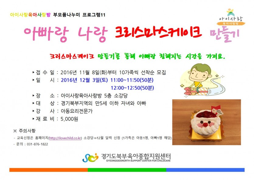 12월 [주말프로그램] 아빠랑 나랑 크리스마스케이크 만들기 페이지 정보 작성자 관리자 댓글 0건 조회 5,913회 작성일 16-11-08 14:08 목록 본문 이전글11월 25일 [소소한 음악회] 16.11.15 다음글2016년 11월 이동식 장난감 일정표 16.10.28 댓글 0 댓글목록 등록된 댓글이 없습니다.