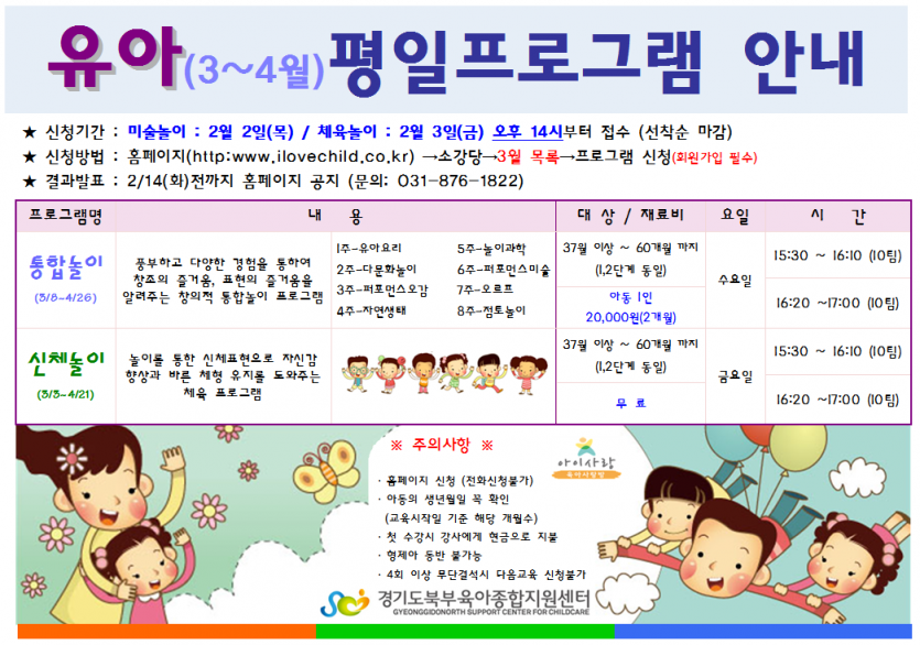 [부모자녀프로그램] 평일프로그램(유아3~4월) 페이지 정보 작성자 관리자 댓글 0건 조회 5,809회 작성일 17-01-20 14:44 목록 본문 첨부파일 확인하세요. 이전글2017년 2월 이동식 장난감 일정표 17.01.24 다음글[부모자녀프로그램] 평일프로그램(영아3~5월) 17.01.20 댓글 0 댓글목록 등록된 댓글이 없습니다.