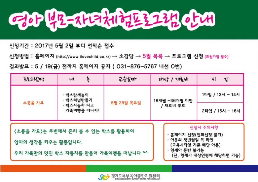 영아 부모자녀체험프로그램 안내 페이지 정보 작성자 관리자 댓글 0건 조회 5,503회 작성일 17-05-02 11:02 목록 본문 이전글동물사랑 예정사랑 캠프 17.05.02 다음글[부모교육] 자녀와 함께하는 책놀이 지도법 17.04.28 댓글 0 댓글목록 등록된 댓글이 없습니다.