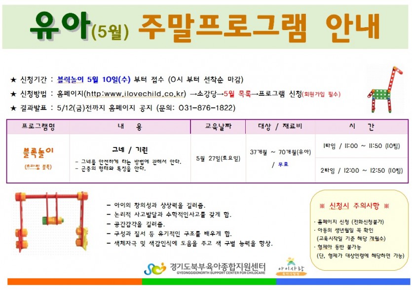 ★ 신청방법 : 홈페이지(http:www.ilovechild.co.kr) →소강당→5월 목록→프로그램 신청(회원가입 필수)