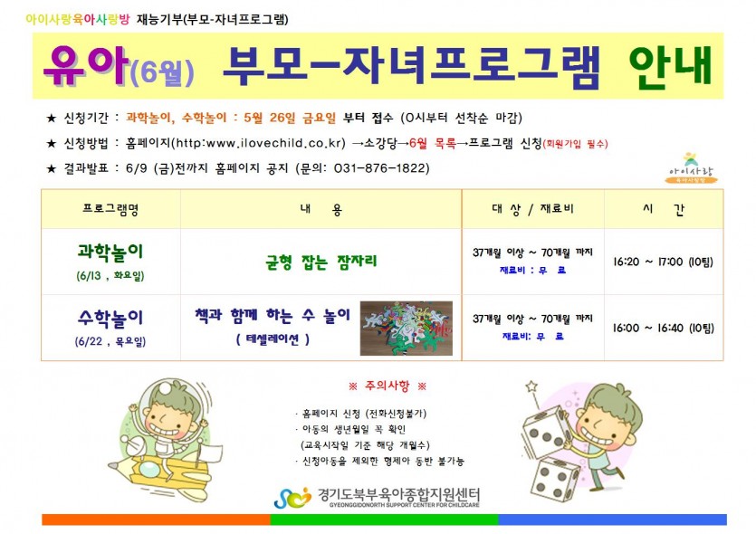 [부모자녀프로그램] 6월 과학/수학놀이 모집안내(유아) 페이지 정보 작성자 관리자 댓글 0건 조회 5,330회 작성일 17-05-17 15:21 목록 본문 자세한 사항은 첨부파일을 참고해 주세요. 이전글[부모취미프로그램] 6월 도자기공예 수업안내 17.05.17 다음글[주말프로그램] 5월 블럭놀이 2타임 교육대상자 공지 17.05.16 댓글 0 댓글목록 등록된 댓글이 없습니다.