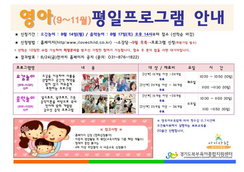 [부모자녀프로그램] 영아 평일프로그램(9~11월) 페이지 정보 작성자 관리자 댓글 0건 조회 5,315회 작성일 17-07-21 11:15 목록 본문 첨부파일을 확인해 주세요. 이전글[부모자녀프로그램] 8월 과학/수학놀이 모집안내(유아) 17.07.21 다음글[부모자녀프로그램] 유아 평일프로그램(9~10월) 17.07.21 댓글 0 댓글목록 등록된 댓글이 없습니다.