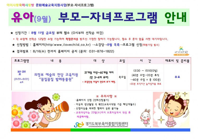 [부모-자녀프로그램] 발레수업-꼼질꼼질 발레동물원(만3~4세 유아) 페이지 정보 작성자 관리자 댓글 0건 조회 5,518회 작성일 17-08-08 10:48 목록 본문 첨부파일을 확인하세요. 이전글[부모취미]8월 도자기공예 교육대상자 공지 17.08.16 다음글[부모자녀프로그램] 8월 수학놀이 1차교육대상자 공지 17.08.03 댓글 0 댓글목록 등록된 댓글이 없습니다.