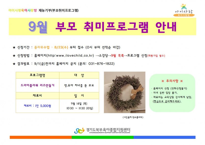 [부모취미] 9월 플라워수업 안내 페이지 정보 작성자 관리자 댓글 0건 조회 5,070회 작성일 17-08-22 14:22 목록 본문 드라이리스 만들기.자세한 사항은 첨부파일을 참고해 주세요. 이전글[부모자녀프로그램] 9~11월 오감놀이1단계 1차교육대상자 공지 17.08.22 다음글대규모행사 [놀자!] 17.08.22 댓글 0 댓글목록 등록된 댓글이 없습니다.