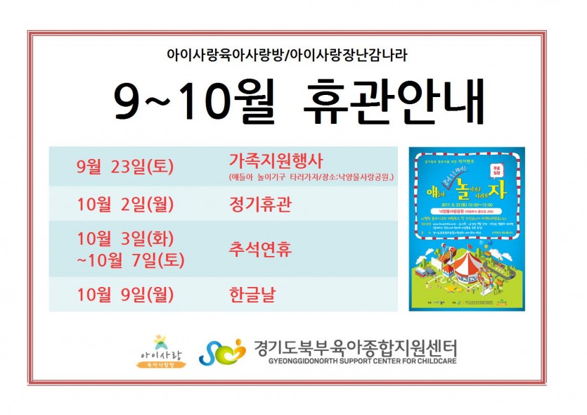 9월~10월 휴관안내 페이지 정보 작성자 관리자 댓글 0건 조회 5,288회 작성일 17-09-13 14:43 목록 본문 9월~10월 휴관안내입니다.첨부파일을 확인해 주시기 바랍니다. 이전글[주말프로그램]10월 블럭놀이 안내 17.09.15 다음글[10월 부모취미] 도자기공예수업 안내 17.09.13 댓글 0 댓글목록 등록된 댓글이 없습니다.