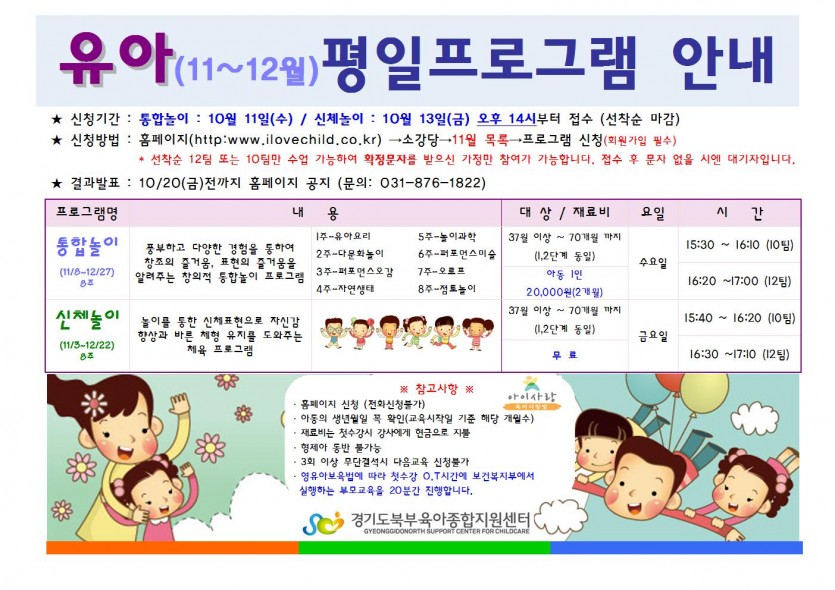 [부모자녀프로그램] 유아 평일프로그램(11~12월) 페이지 정보 작성자 관리자 댓글 0건 조회 5,521회 작성일 17-09-29 15:56 목록 본문 첨부파일을 참고해 주세요. 이전글아버지교육&발레프로그램 접수안내 17.10.10 다음글[10월 수학놀이] 1차 교육대상자 공지 17.09.28 댓글 0 댓글목록 등록된 댓글이 없습니다.