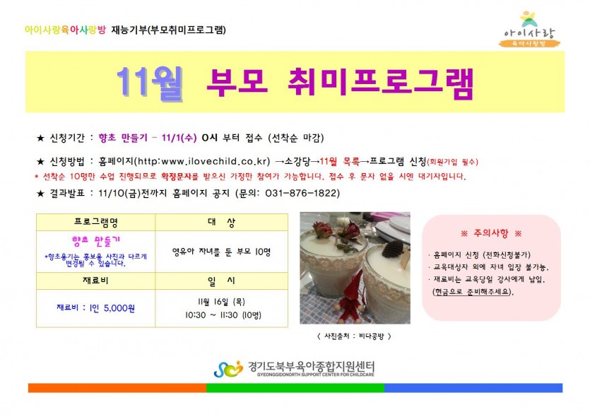 재료비 : 1인 5,000원 | 11월 16일 (목) 10:30 ~ 11:30 (10명) |