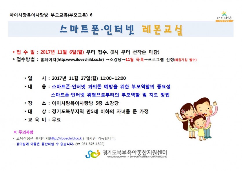 - 강의실에 아동은 동반하실 수 없습니다. (☎ 031-876-1822)