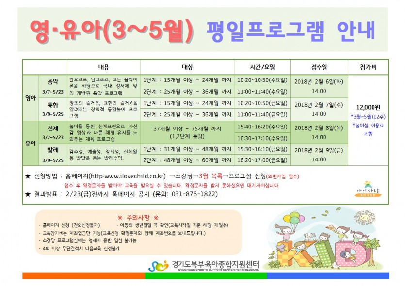 영유아(3~5월) 평일부모자녀프로그램 안내 페이지 정보 작성자 관리자 댓글 0건 조회 5,578회 작성일 18-01-30 11:04 목록 본문 자세한 사항은 첨부파일을 참고해 주세요. 이전글3월 프로그램 안내 18.02.07 다음글KB국민은행&사회복지공동모금회 지원안내 18.01.17 댓글 0 댓글목록 등록된 댓글이 없습니다.