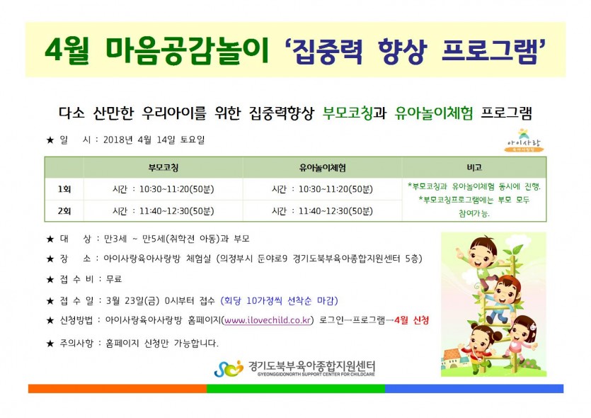 4월 마음공감놀이 프로그램안내 페이지 정보 작성자 관리자 댓글 0건 조회 5,908회 작성일 18-03-16 10:18 목록 본문 다소 산만한 우리아이를 위한 집중력향상 부모코칭과 유아놀이체험 프로그램 *자세한사항은 첨부파일을 참고해 주세요 이전글4월 육아사랑방 프로그램 안내 18.03.22 다음글5월 어린이날 행사 18.03.14 댓글 0 댓글목록 등록된 댓글이 없습니다.