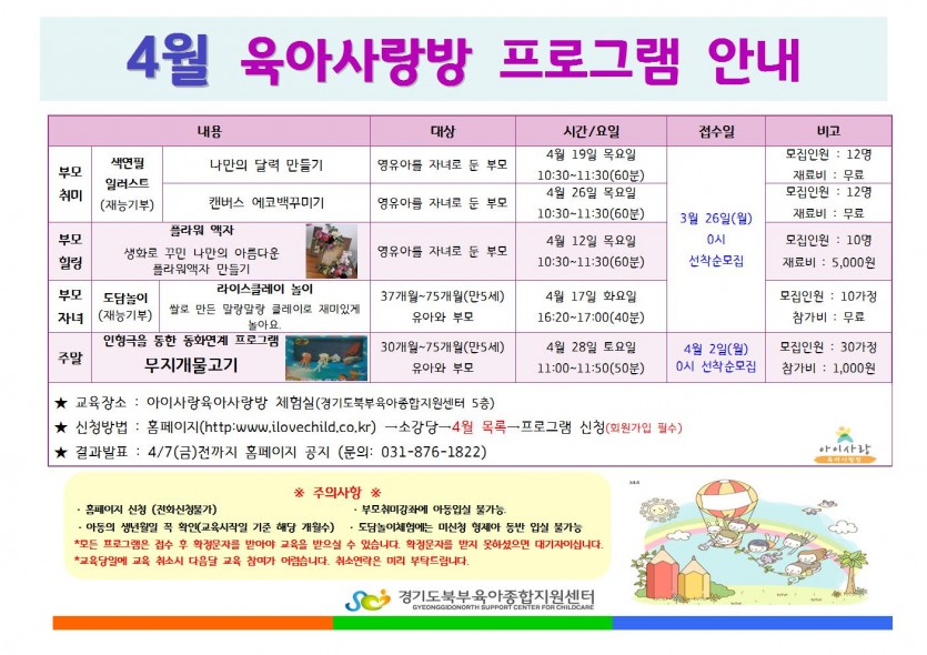 4월 육아사랑방 프로그램 안내 페이지 정보 작성자 관리자 댓글 0건 조회 5,595회 작성일 18-03-22 10:26 목록 본문 자세한 사항은 첨부파일을 참고해 주세요. 이전글4월 마음공감놀이 1타임 1차교육대상자 공지 18.03.27 다음글4월 마음공감놀이 프로그램안내 18.03.16 댓글 0 댓글목록 등록된 댓글이 없습니다.