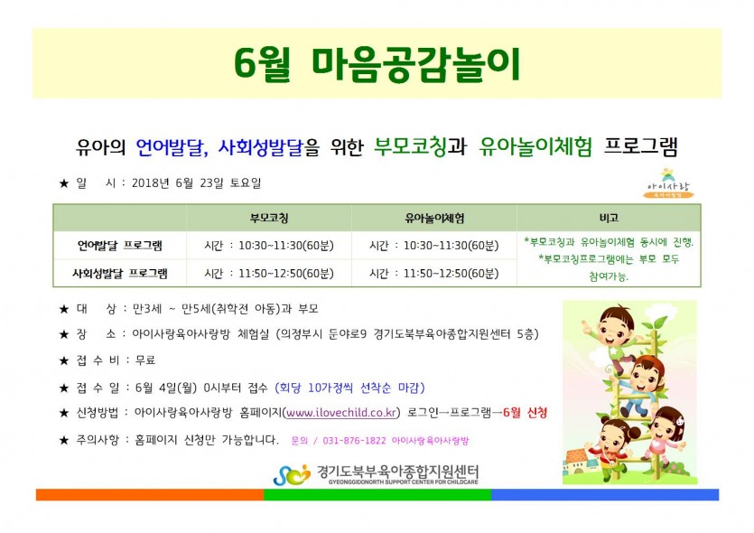 6월 마음공감놀이 안내 페이지 정보 작성자 관리자 댓글 0건 조회 5,590회 작성일 18-05-17 11:39 목록 본문 *자세한 사항은 첨부파일을 확인해주세요. 이전글6월 육아사랑방 프로그램안내 18.05.17 다음글6~8월 유아(신체2단계) 1차교육대상자공지 18.05.16 댓글 0 댓글목록 등록된 댓글이 없습니다.