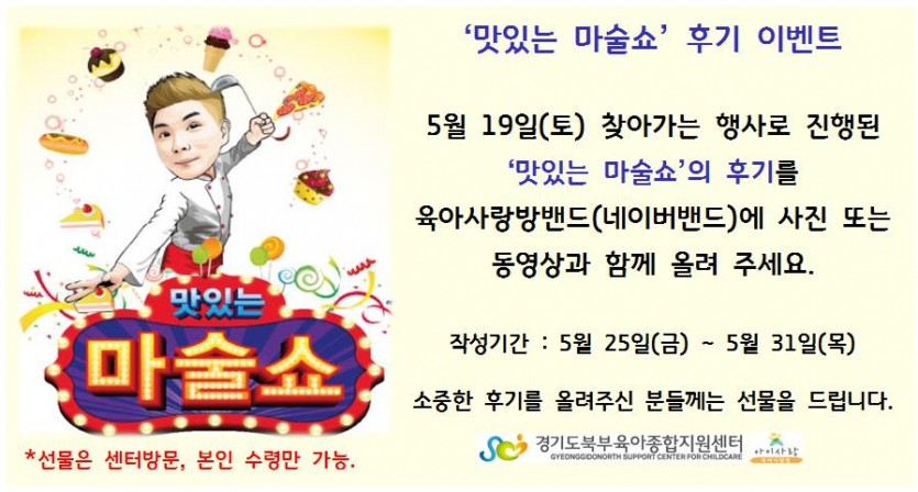 5월 찾아가는 행사 "찾아가는 마술쇼"후기 이벤트 페이지 정보 작성자 관리자 댓글 0건 조회 5,357회 작성일 18-05-25 10:10 목록 본문 *자세한 사항은 첨부파일을 참고해 주세요. 이전글6월 휴관공지 18.05.29 다음글6월 육아사랑방 프로그램안내 18.05.17 댓글 0 댓글목록 등록된 댓글이 없습니다.