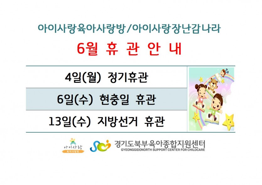 6월 휴관공지 페이지 정보 작성자 관리자 댓글 0건 조회 5,441회 작성일 18-05-29 10:12 목록 본문 *자세한 사항은 첨부파일을 참고해주세요. 이전글6월 도담놀이-티셔츠꾸미기 1차 교육대상자 공지 18.05.31 다음글5월 찾아가는 행사 "찾아가는 마술쇼"후기 이벤트 18.05.25 댓글 0 댓글목록 등록된 댓글이 없습니다.