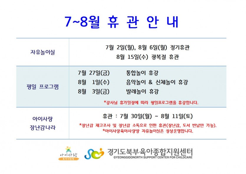 7~8월 휴관공지 페이지 정보 작성자 관리자 댓글 0건 조회 5,349회 작성일 18-07-02 11:59 목록 본문 *첨부파일을 참고해 주세요. 이전글7월 14일 동화연계 인형극 변경 18.07.03 다음글7월 부모교육 "3대가 함께하는 조부모교육"안내 18.06.20 댓글 0 댓글목록 등록된 댓글이 없습니다.