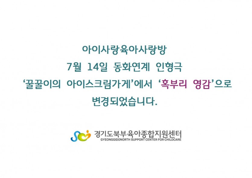7월 14일 동화연계 인형극 변경 페이지 정보 작성자 관리자 댓글 0건 조회 5,466회 작성일 18-07-03 17:51 목록 본문 *자세한 사항을 첨부파일을 확인해주세요. 이전글7월 부모취미 비즈십자수 1차교육대상자공지 18.07.05 다음글7~8월 휴관공지 18.07.02 댓글 0 댓글목록 등록된 댓글이 없습니다.