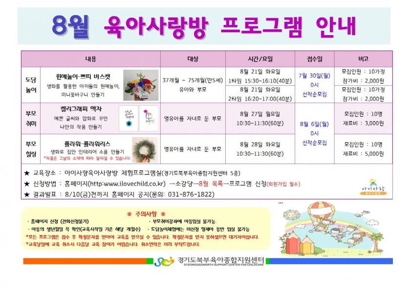 8월 육아사랑방 프로그램 안내 페이지 정보 작성자 관리자 댓글 0건 조회 5,515회 작성일 18-07-20 11:15 목록 본문 자세한 사항은 첨부파일을 참고해 주세요. 이전글2018년 8월 이동식 도서관 일정표 18.07.24 다음글9월~11월 평일프로그램 안내 18.07.19 댓글 0 댓글목록 등록된 댓글이 없습니다.