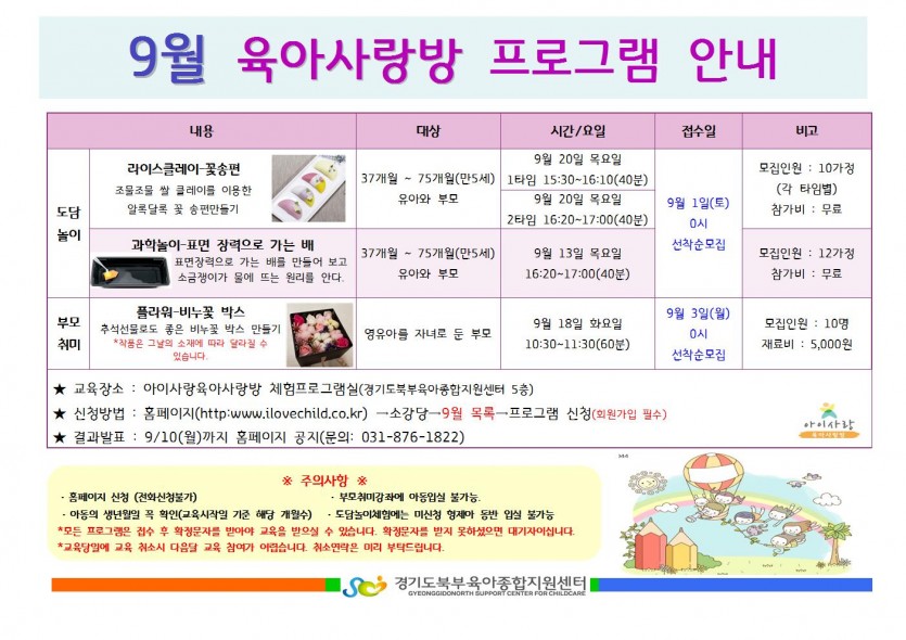 9월 육아사랑방 프로그램 안내 페이지 정보 작성자 관리자 댓글 0건 조회 5,551회 작성일 18-08-31 09:21 목록 본문 *자세한 사항은 첨부파일을 참고하세요. 이전글9월 휴관안내 18.09.03 다음글9월 퍼포먼스미술 2타임 1차교육대상자 공지 18.08.28 댓글 0 댓글목록 등록된 댓글이 없습니다.