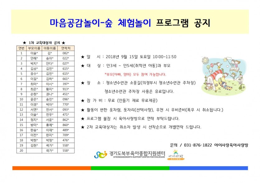 9월 마음공감놀이 숲체험 1차교육대상자 공지 및 안내 페이지 정보 작성자 관리자 댓글 0건 조회 5,529회 작성일 18-09-04 17:06 목록 본문 *자세한 사항은 첨부파일을 참고해 주세요. 이전글9월 과학놀이 1차교육대상자 공지 18.09.05 다음글9월 휴관안내 18.09.03 댓글 0 댓글목록 등록된 댓글이 없습니다.