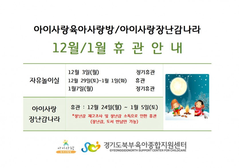 12월 / 1월 휴관공지 페이지 정보 작성자 관리자 댓글 0건 조회 5,417회 작성일 18-11-23 11:26 목록 본문 *자세한 사항은 첨부파일을 확인해주세요. 이전글2018년 12월 이동식 도서관 일정표 18.11.27 다음글12월 부모교육-예비초등 부모를 부탁해 18.11.16 댓글 0 댓글목록 등록된 댓글이 없습니다.