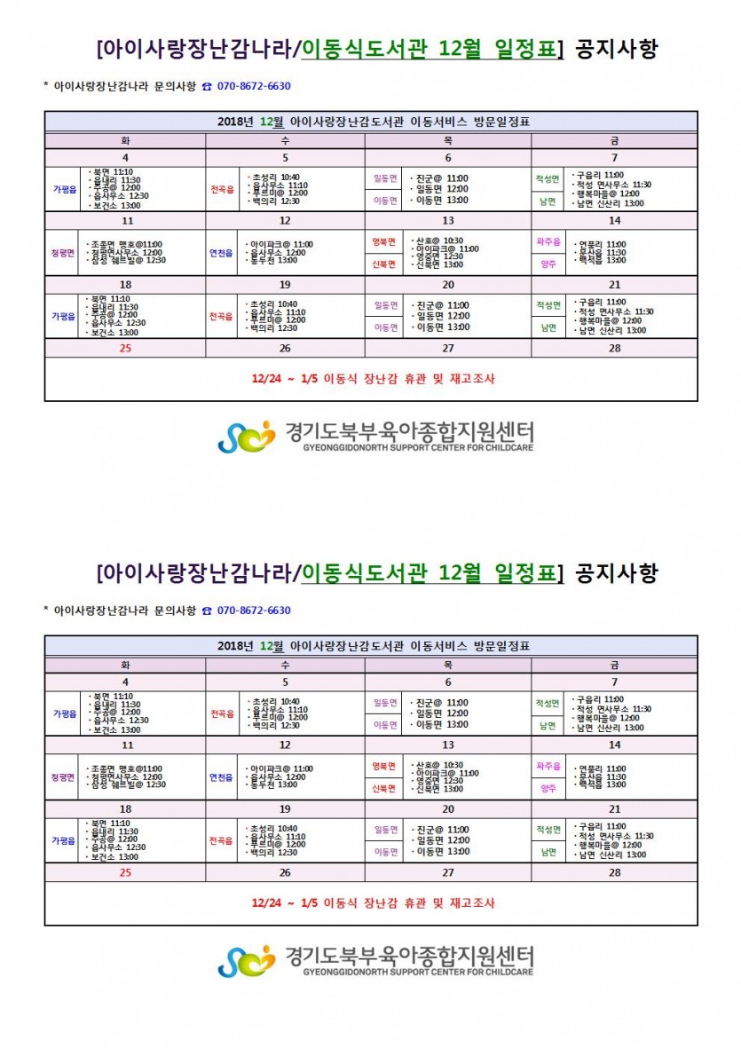 2018년 12월 이동식 도서관 일정표 페이지 정보 작성자 관리자 댓글 0건 조회 5,314회 작성일 18-11-27 14:21 목록 본문 이전글화목놀이 <아빠와 함께하는 신체놀이> 모집안내 18.12.04 다음글12월 / 1월 휴관공지 18.11.23 댓글 0 댓글목록 등록된 댓글이 없습니다.