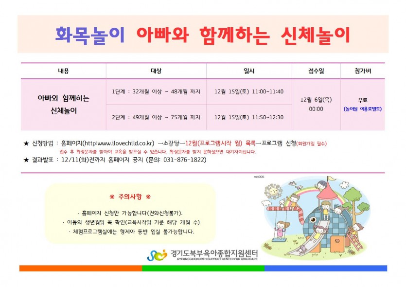 화목놀이 <아빠와 함께하는 신체놀이> 모집안내 페이지 정보 작성자 관리자 댓글 0건 조회 5,507회 작성일 18-12-04 15:54 목록 본문 *자세한 사항은 첨부파일을 첨부해 주세요. 이전글12월 부모교육 1차교육대상자 안내 18.12.04 다음글2018년 12월 이동식 도서관 일정표 18.11.27 댓글 0 댓글목록 등록된 댓글이 없습니다.