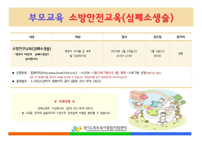 부모교육<소방대피훈련-심폐소생술> 모집안내 페이지 정보 작성자 관리자 댓글 0건 조회 5,454회 작성일 18-12-28 17:41 목록 본문 *자세한 사항은 첨부파일을 확인해주세요. 이전글장난감나라&놀이실 운영시간 변경안내 19.01.04 다음글12월 화목놀이 1차교육대상자 공지 18.12.11 댓글 0 댓글목록 등록된 댓글이 없습니다.