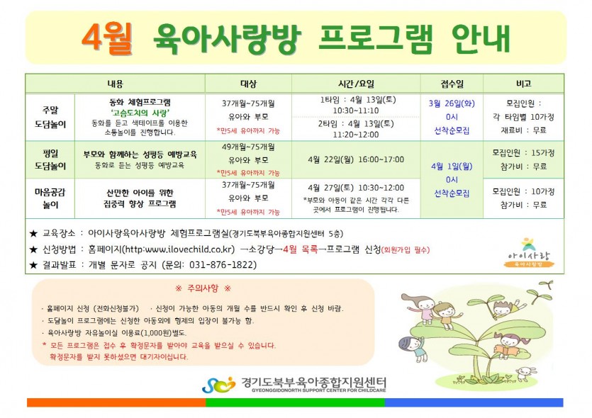 육아사랑방 4월 프로그램 안내 페이지 정보 작성자 관리자 댓글 0건 조회 5,515회 작성일 19-03-19 16:35 목록 본문 *자세한 사항은 첨부파일을 참고 해 주세요. 이전글의정부역 365 언제나 경기도청 민원센터 이용종료 안내 19.03.21 다음글3월 부모교육 – 아이와 부모의 애착형성 1차공지 19.03.12 댓글 0 댓글목록 등록된 댓글이 없습니다.