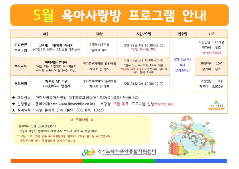 5월 육아사랑방 프로그램 안내 페이지 정보 작성자 관리자 댓글 0건 조회 5,425회 작성일 19-04-15 17:03 목록 본문 *자세한 사항은 첨부파일을 참고해 주세요. 이전글2019년 5월 이동식 도서관 일정표 19.04.22 다음글4월 마음공감놀이-집중력향상 1자교육 대상자 공지 19.04.08 댓글 0 댓글목록 등록된 댓글이 없습니다.