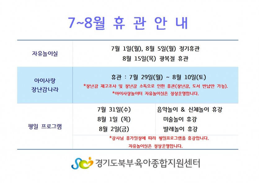 아이사랑놀이터 7, 8월 휴관 및 휴강안내 페이지 정보 작성자 관리자 댓글 0건 조회 5,475회 작성일 19-06-17 17:53 목록 본문 *자세한 사항은 첨부파일을 확인해주세요. 이전글이동식놀이교실(전지적아이시점)-부모교육신청 19.06.19 다음글아이사랑놀이터 7월 프로그램 안내 19.06.17 댓글 0 댓글목록 등록된 댓글이 없습니다.