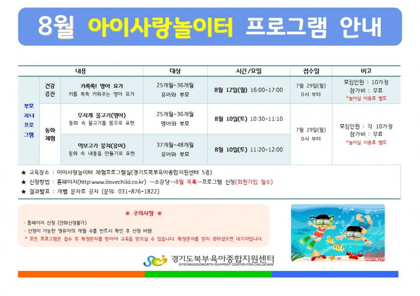 아이사랑놀이터 8월 프로그램 안내 페이지 정보 작성자 관리자 댓글 0건 조회 5,482회 작성일 19-07-19 18:31 목록 본문 *자세한 사항은 첨부파일을 참고해주세요. 이전글영유아(9~11월) 평일프로그램 안내 19.07.26 다음글2019년 7,8월 이동식 도서관 일정표 19.06.27 댓글 0 댓글목록 등록된 댓글이 없습니다.