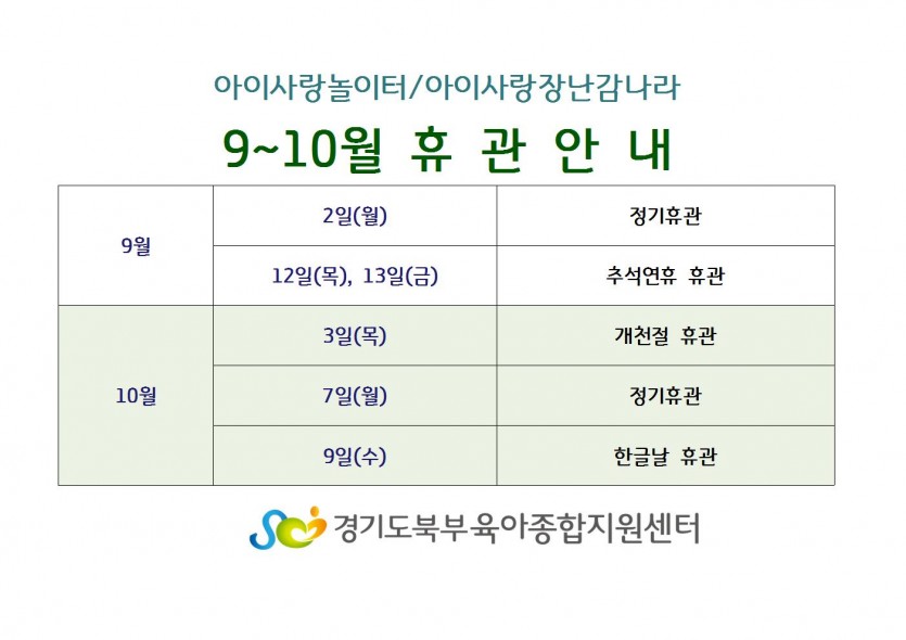 9~10월 휴관공지 페이지 정보 작성자 관리자 댓글 0건 조회 5,298회 작성일 19-08-14 16:26 목록 본문 *자세한 사항은 첨부파일을 참고해주세요. 이전글9~11월 음악놀이 1단계 1차교육대상자 공지 19.08.16 다음글아이사랑놀이터 9월 프로그램 안내 19.08.14 댓글 0 댓글목록 등록된 댓글이 없습니다.