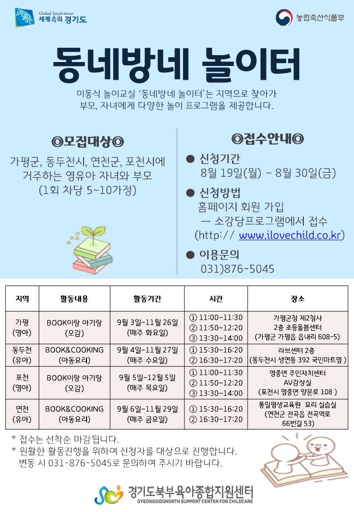 (농림부) 이동식 놀이교실 동네방네 놀이터 신청안내 페이지 정보 작성자 관리자 댓글 0건 조회 5,851회 작성일 19-08-19 13:39 목록 본문 * 자세한 사항은 첨부파일을 확인해주세요. 이전글2019년 9월 이동식 도서관 일정표 19.08.26 다음글9~11월 발레놀이 2단계 1차교육대상자공지 19.08.16 댓글 0 댓글목록 등록된 댓글이 없습니다.