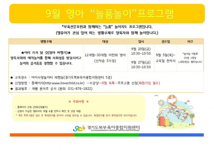 9월 영아 늘품놀이 프로그램 안내 페이지 정보 작성자 관리자 댓글 0건 조회 5,543회 작성일 19-09-05 18:03 목록 본문 *자세한 사항은 첨부파일을 참고해주세요. 이전글아이사랑놀이터 10월 프로그램 안내 19.09.17 다음글영유아가족지원행사 "전지적아이시점" 안내 19.09.05 댓글 0 댓글목록 등록된 댓글이 없습니다.