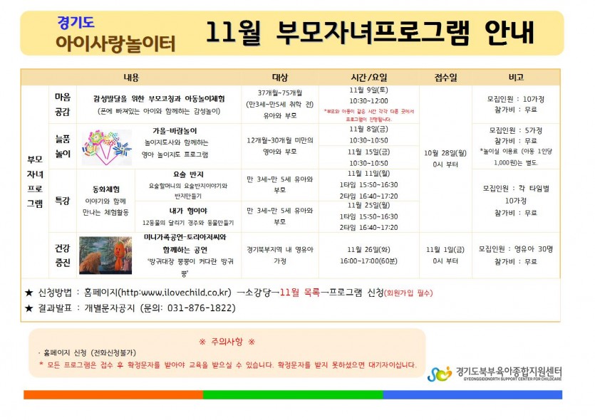 11월 부모자녀프로그램 안내 페이지 정보 작성자 관리자 댓글 0건 조회 5,454회 작성일 19-10-17 15:23 목록 본문 *자세한 사항은 첨부파일을 참고해주세요. 이전글11월 부모교육 안내 19.10.17 다음글유아 늘품놀이프로그램 모집안내 19.10.11 댓글 0 댓글목록 등록된 댓글이 없습니다.