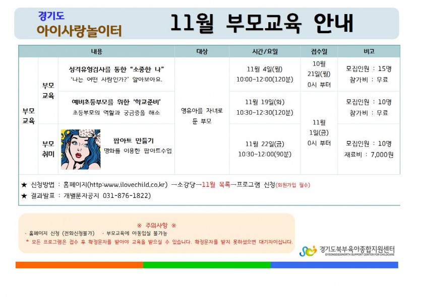 11월 부모교육 안내 페이지 정보 작성자 관리자 댓글 0건 조회 5,435회 작성일 19-10-17 15:24 목록 본문 *자세한 사항은 첨부파일을 참고해주세요. 이전글11월~12월 휴관안내 19.10.21 다음글11월 부모자녀프로그램 안내 19.10.17 댓글 0 댓글목록 등록된 댓글이 없습니다.