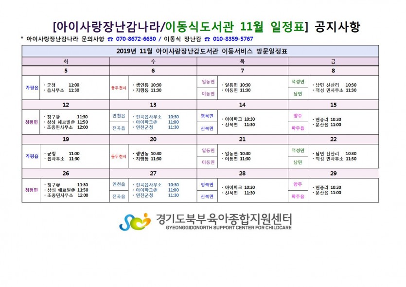 2019년 11월 이동식 도서관 일정표 페이지 정보 작성자 관리자 댓글 0건 조회 5,440회 작성일 19-10-28 11:20 목록 본문 2019년 11월 이동식 도서관 일정표 이전글아이사랑놀이터 12월 크리스마스행사 안내 19.11.05 다음글10월 부모힐링 모집안내 19.10.21 댓글 0 댓글목록 등록된 댓글이 없습니다.